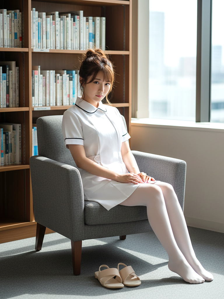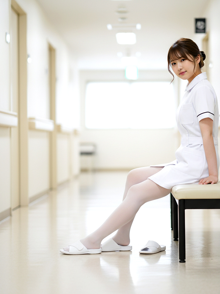 ナースサンダルを脱いで、少しだけリラックスした表情でくつろぐ姿からは、舞台裏のリアルな魅力が伝わってきます。白衣の下に隠された、パンスト越しのしなやかな脚線美は、日頃の忙しさとは対照的に、優雅で洗練された印象を与えます。白ストッキングでも、黒ストッキングでも、その肌触りや透け感が、見る者の想像力を掻き立てるのかもしれません。