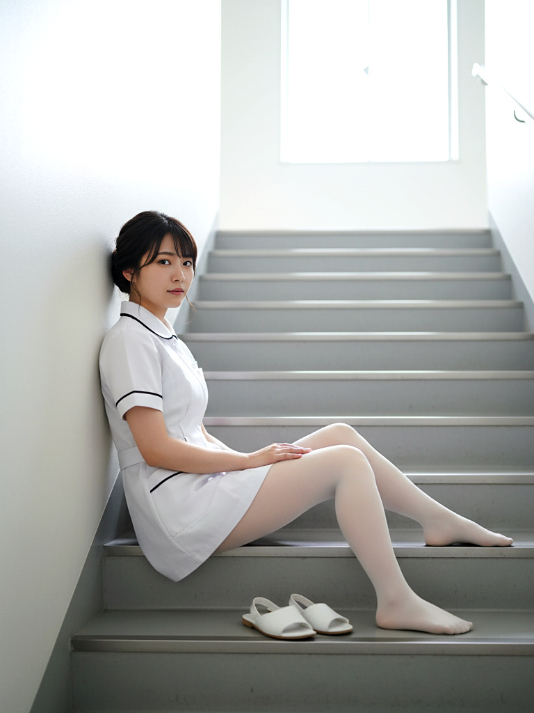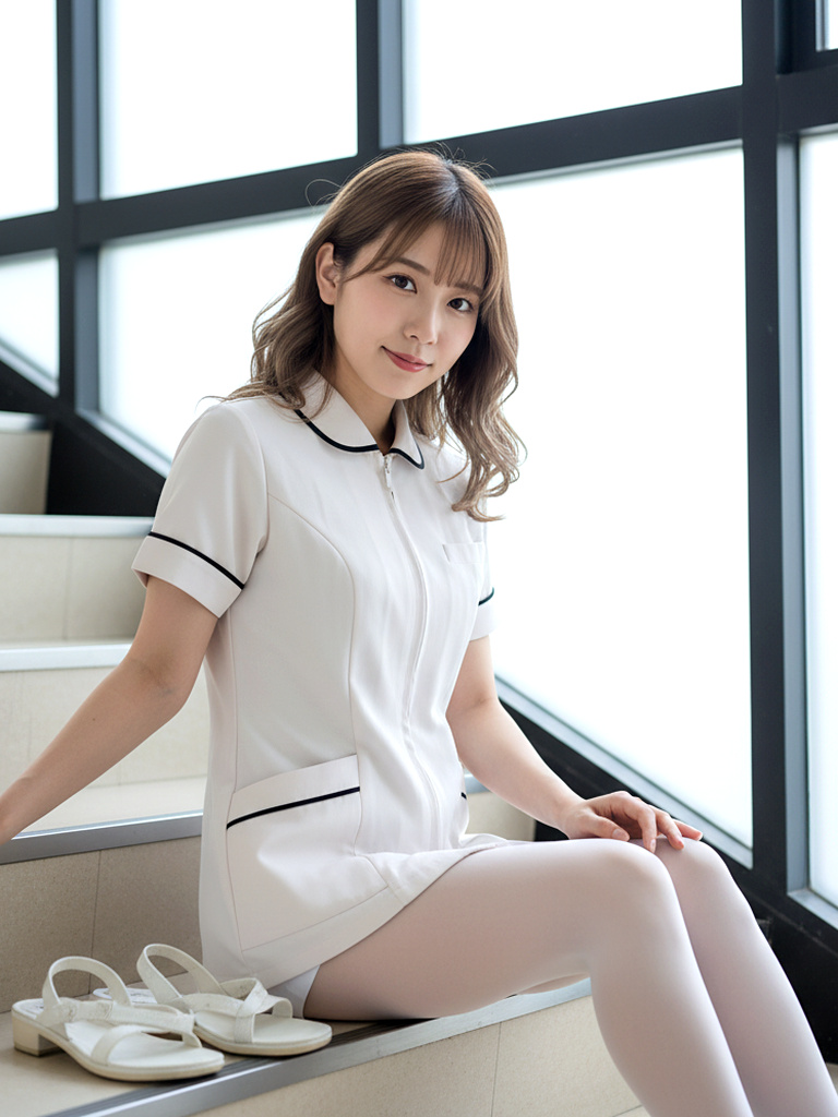 ナースサンダルを脱いでくつろぐ姿から、日常のリアルな魅力をお楽しみください。