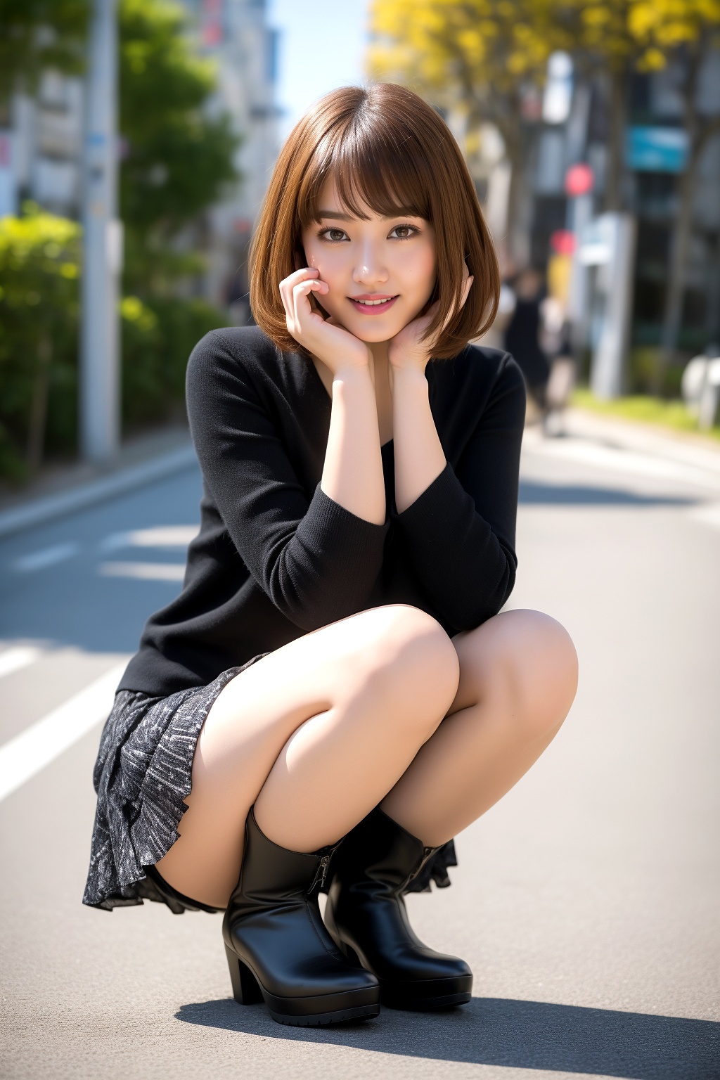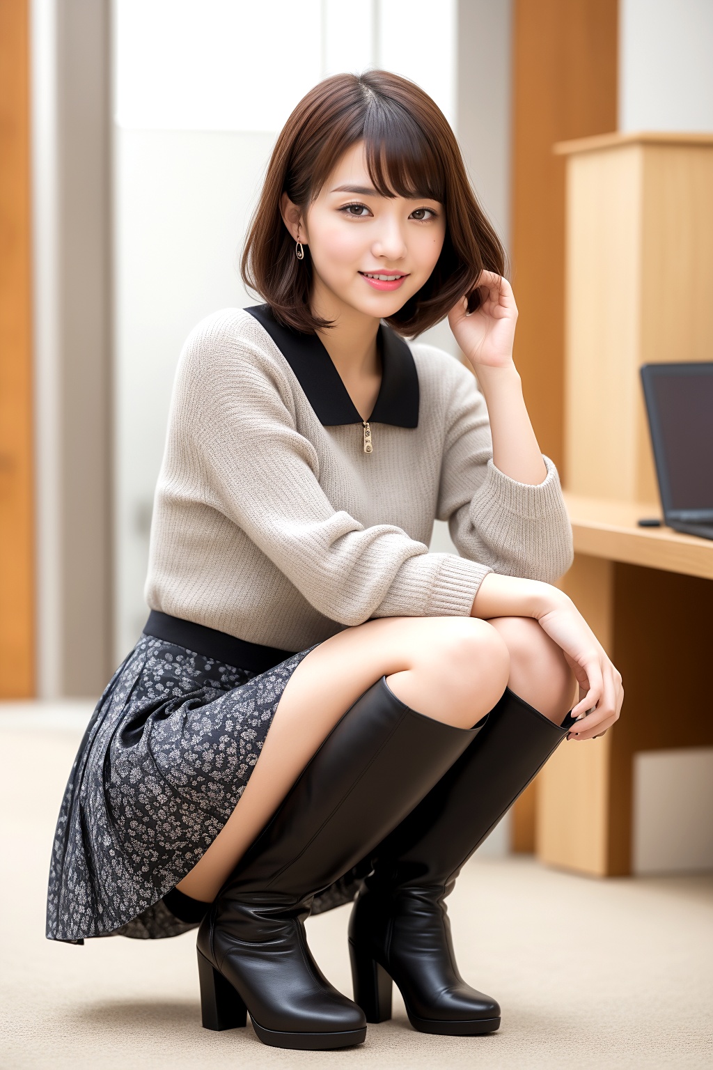 ミニスカートにブーツを合わせ、しゃがむ仕草を見せるボブカットの美人。