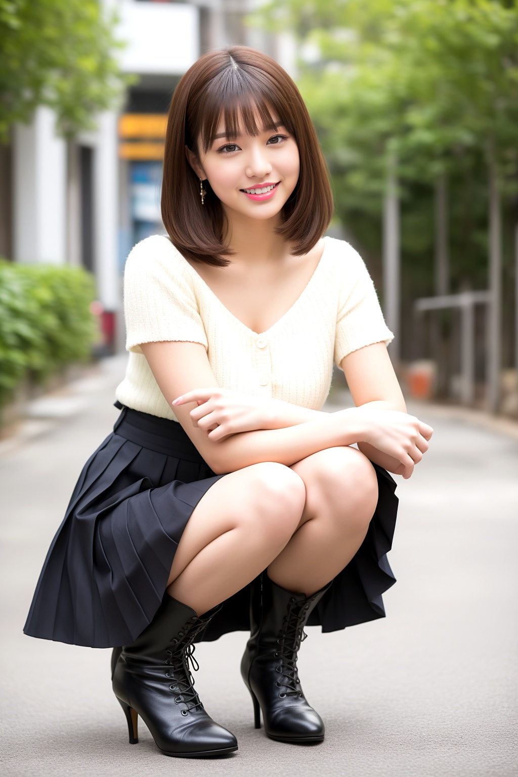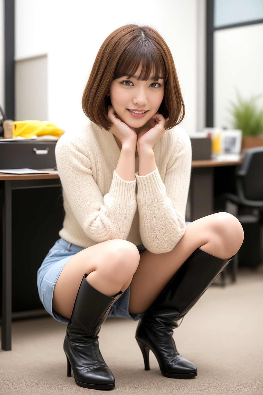 パンチラミニスカートにブーツを合わせ、しゃがむ仕草を見せるボブカットの美人。