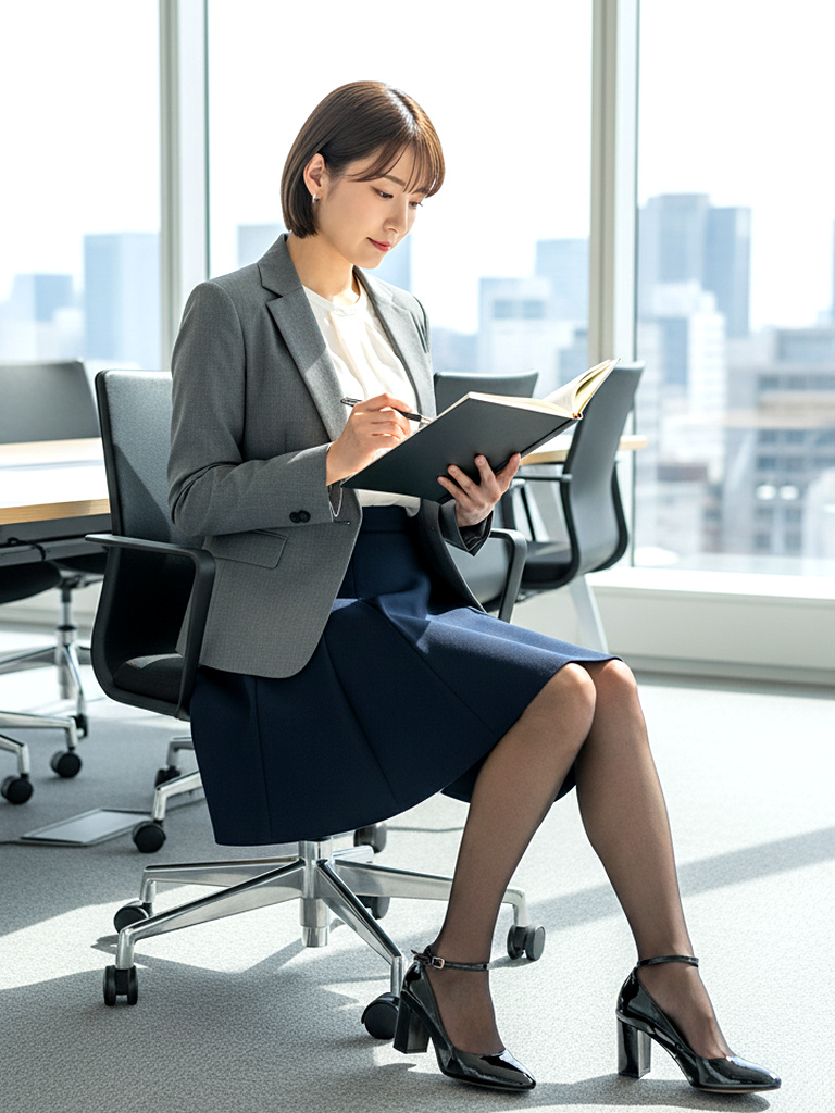 会議中、テーブルの下に見える後輩OLの脚元。