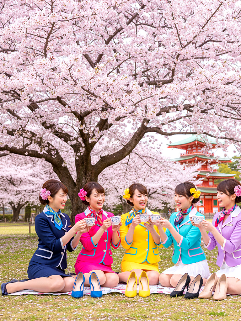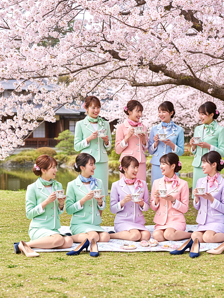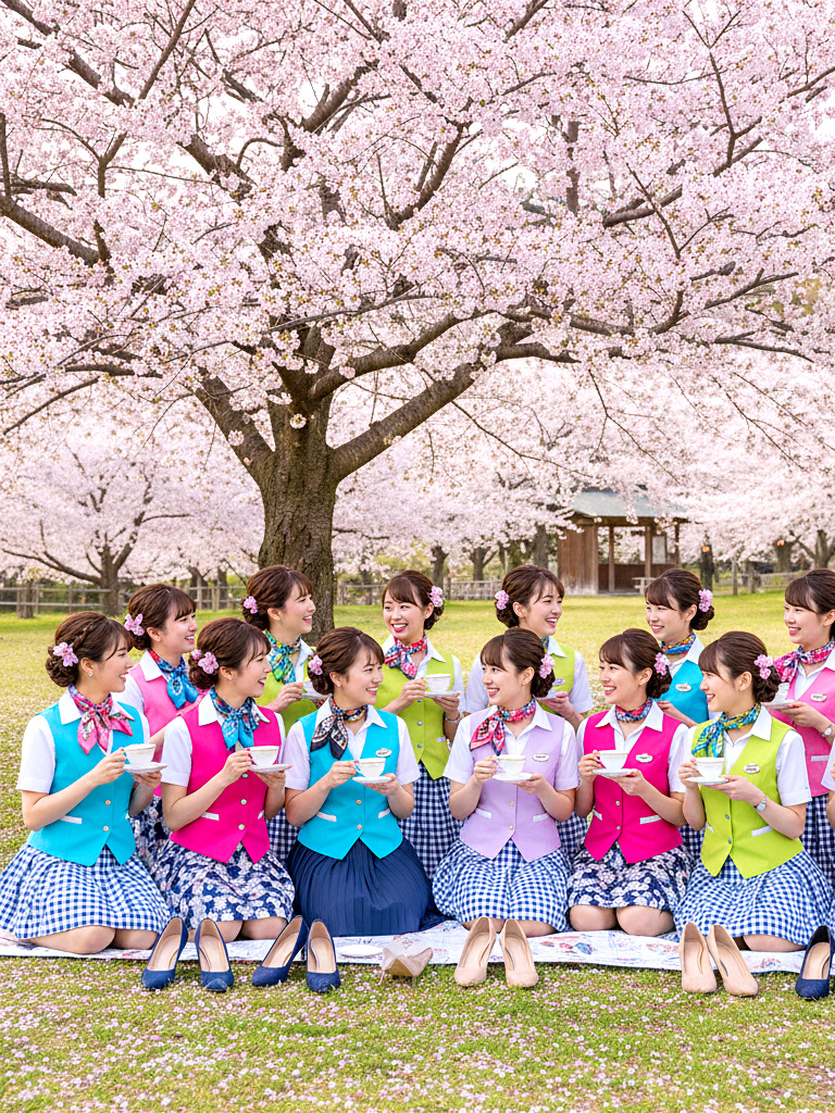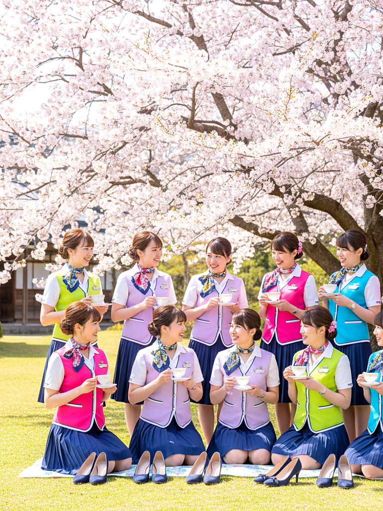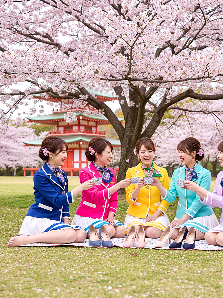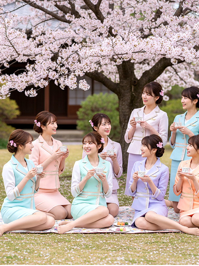 美人CAたちが制服姿のまま、春の陽気に誘われて花見を楽しむ様子を収めた作品です。上品で洗練された立ち居振る舞いの中にも、靴を脱いでリラックスする姿や、自然体の笑顔があふれています。桜の下で見せる彼女たちの落ち着いた雰囲気と、品のある仕草をお楽しみください。