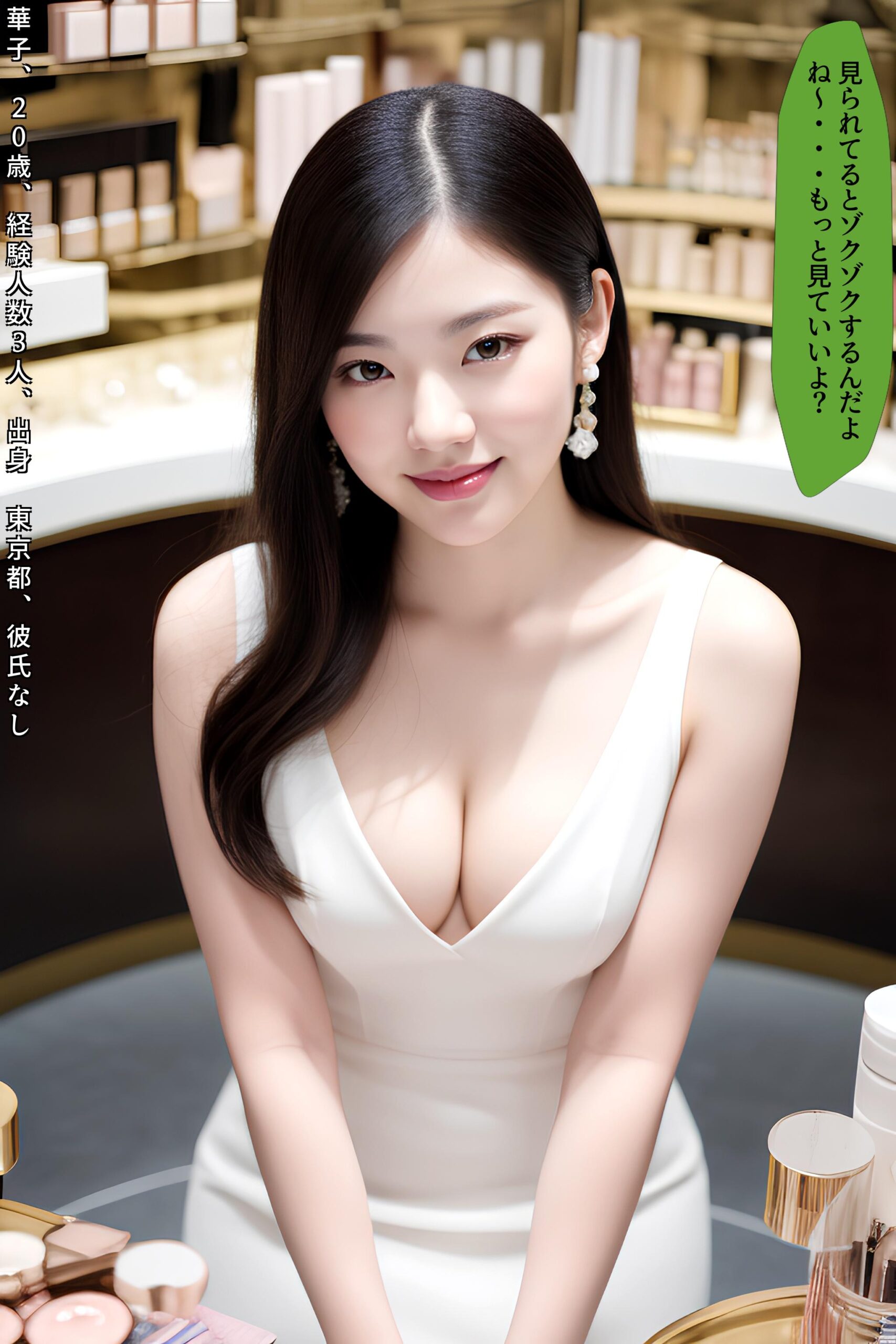 中年という年齢を重ねたからこそ、こうした「特別な体験」への渇望は強まるのかもしれません。日常の喧騒を忘れ、ただひたすらに目の前の美しさに酔いしれる。美容部員という立場でありながら、その接客は単なるサービス業を超え、一種のアートのようでもあります。彼女の笑顔、声のトーン、そして何よりもその豊満な胸元から覗く谷間が織りなすハーモニーは、訪れる全ての人々を魅了し、特別な非日常へと誘います。この作品を手に取ったあなたは、きっとその世界に引き込まれることでしょう。