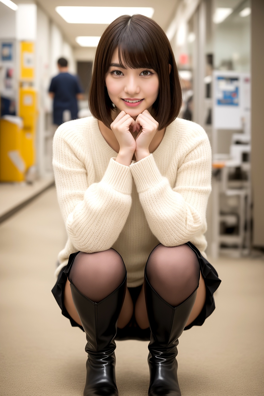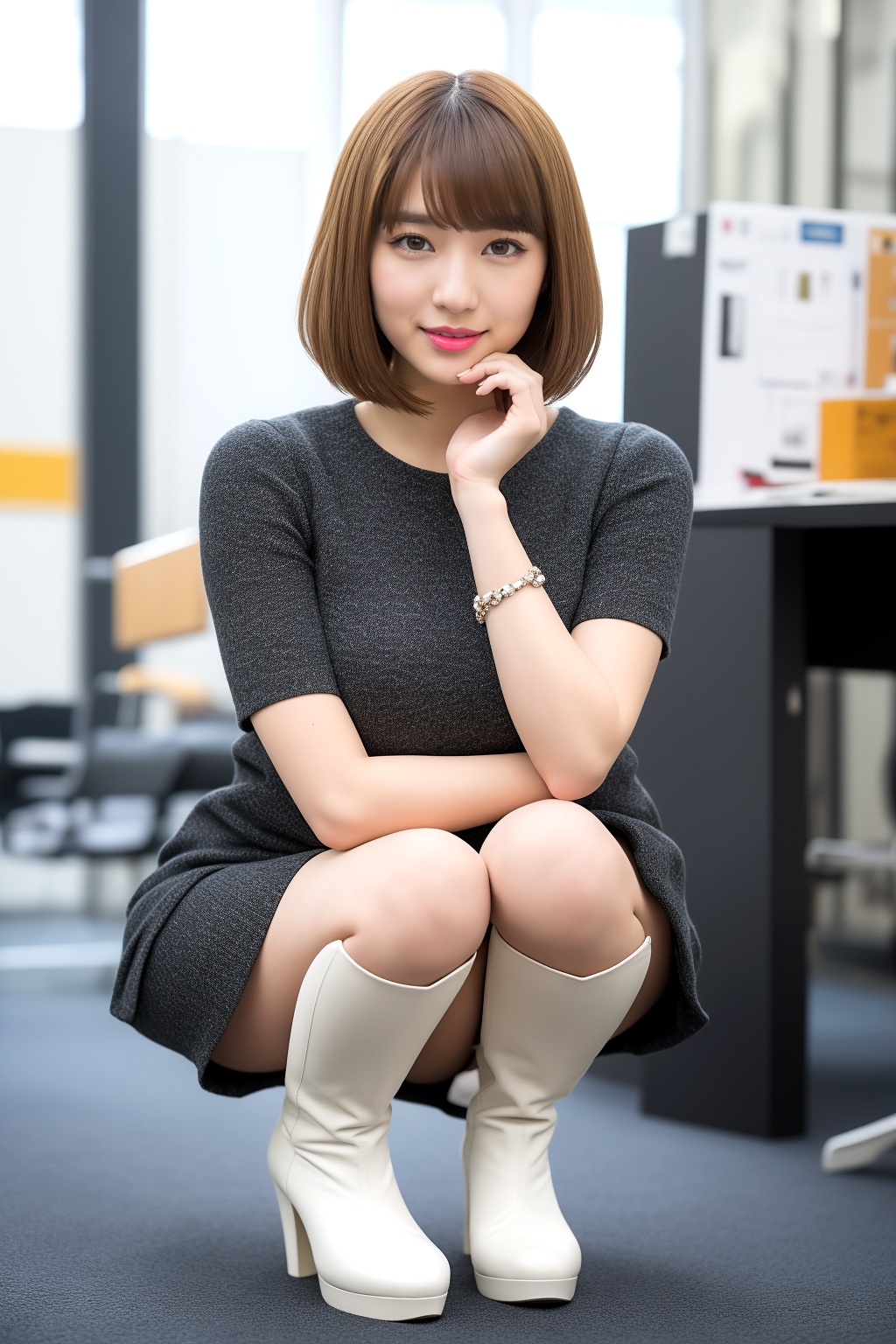 ミニスカートにブーツを合わせ、しゃがむ仕草を見せるボブカットの美人。