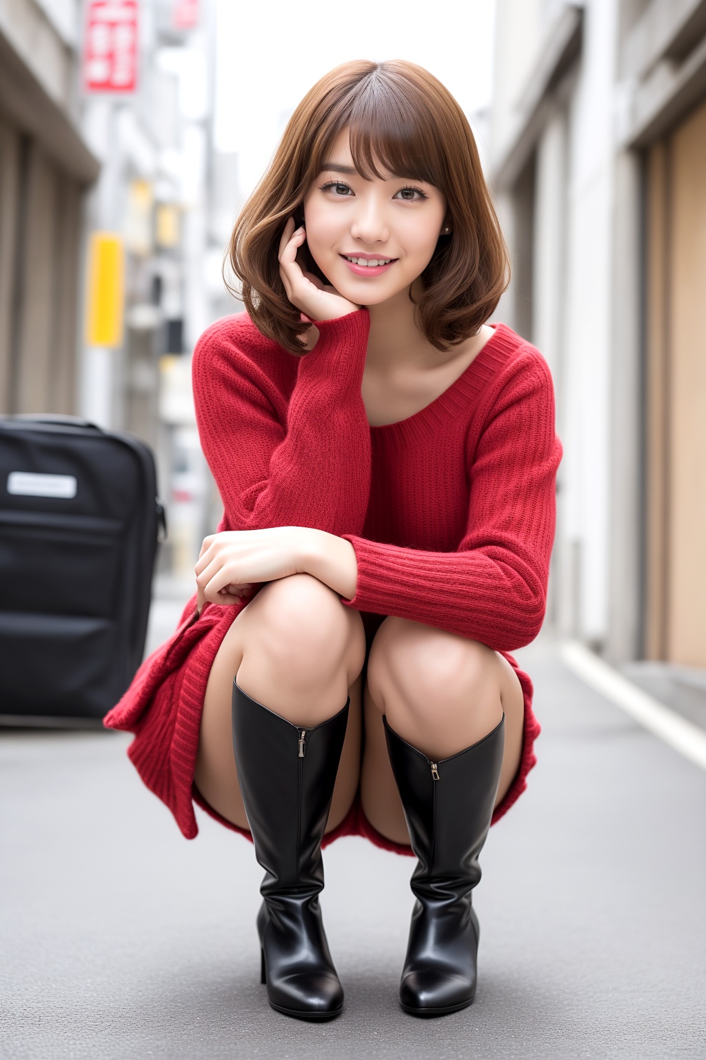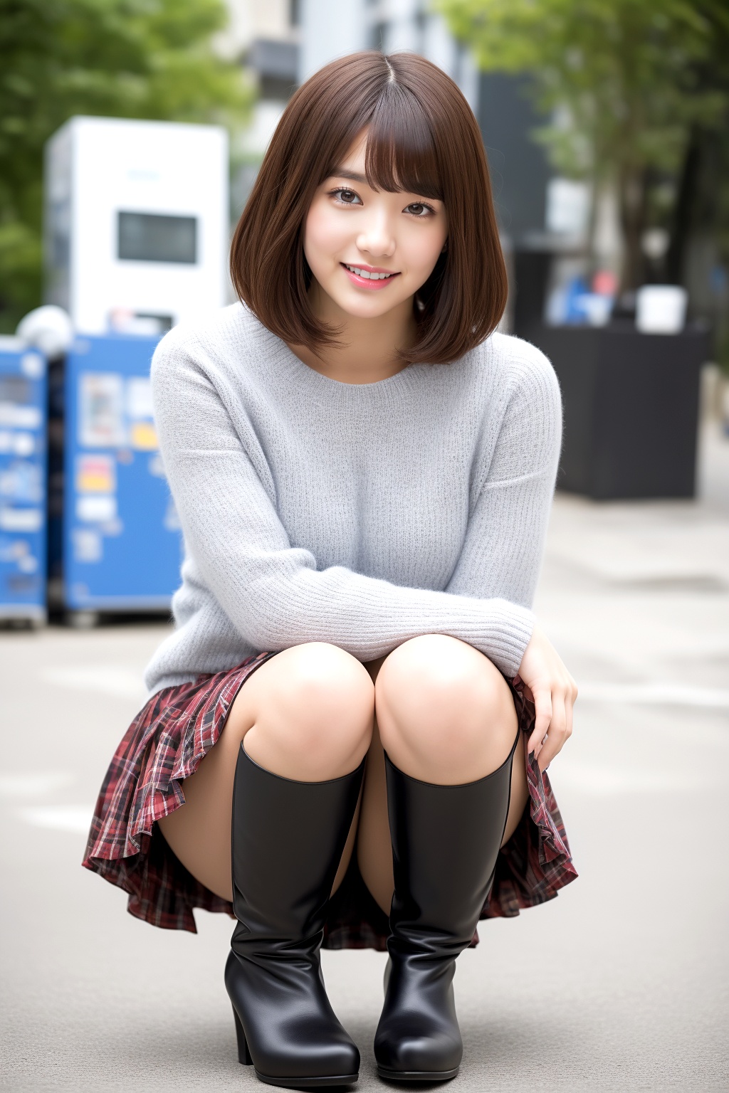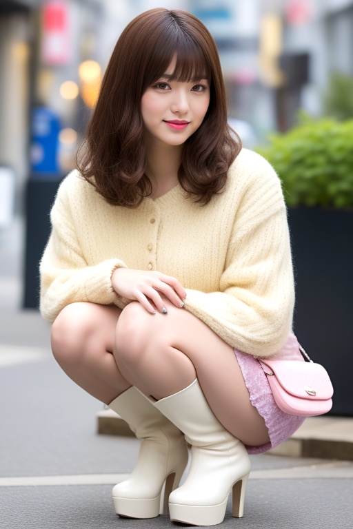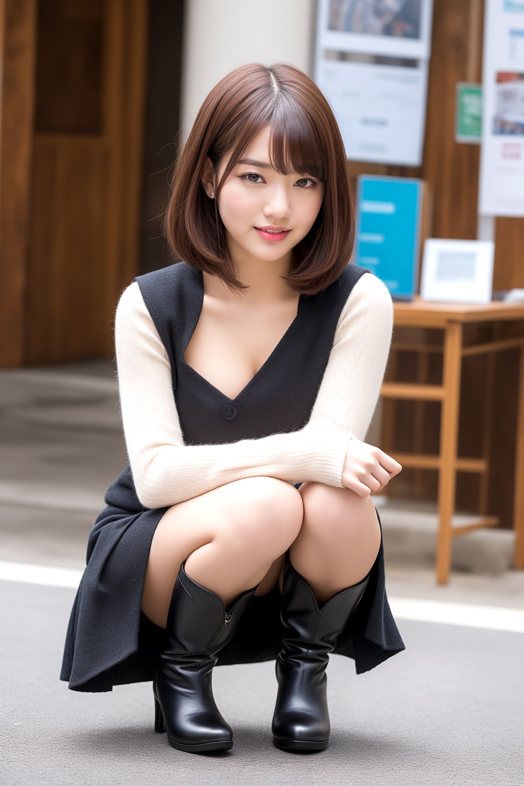 この美しい瞬間を、じっくりとご堪能ください。ボブヘアの洗練された雰囲気と、ミニスカート×ブーツの大胆な組み合わせ、そしてしゃがむという仕草が織りなす、特別な美の光景を、心ゆくまで味わっていただければ幸いです。