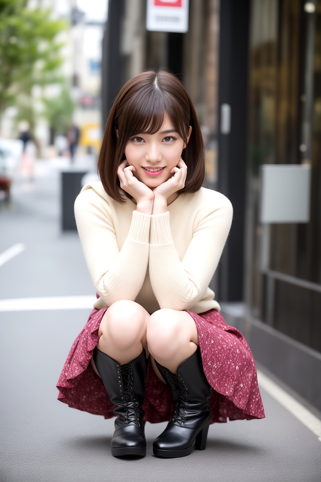 ミニスカートにロングブーツを合わせ、しゃがむ仕草を見せるボブカットの美人。街角でふと目にしたその瞬間は、カジュアルさの中に色気と上品さが同居する特別な一コマです。彼女のボブヘアは、顔周りをすっきりと見せ、その洗練された雰囲気を一層引き立てています。